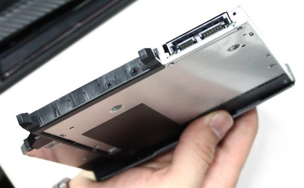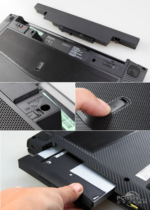 联想的UltraBay位于光驱位,这也是目前相对成熟且风险较低的做法,其采用免工具拆装设计,如果要扩展配件需要首先将电池取下,再将隐藏在电池内测的锁定装置打开,向下滑动D壳中央位置的开关并同时抽出光驱位硬件即可。